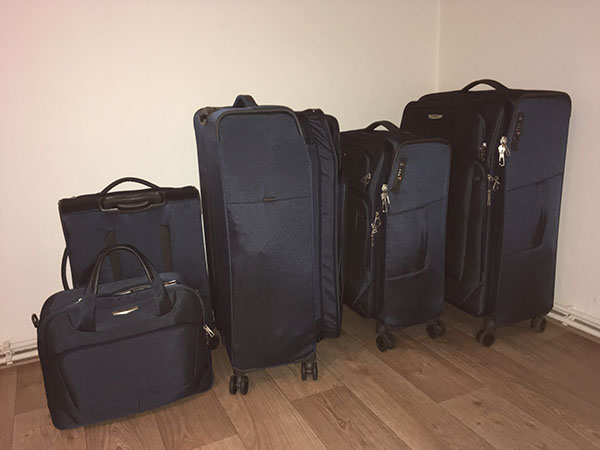 Vôbec nemám predstavu, či sa do nich budeme zmestiť. Kúpili sme si dva najväčšie Samsonite Spark (4-kolečkové) a v rovnakom modeli máme aj stredný a najmenší + niečo ako taška. Proste krásna výbavička v tmavomodrej farbe. Snáď sa nám budú na letisku ľahko hľadať.