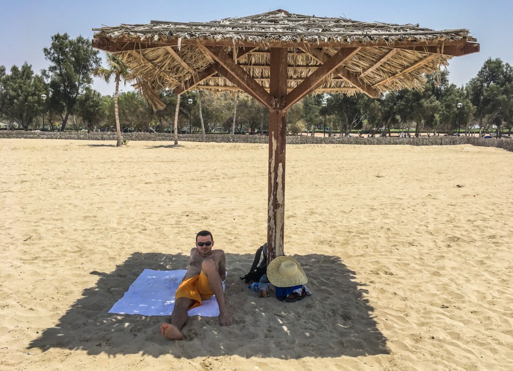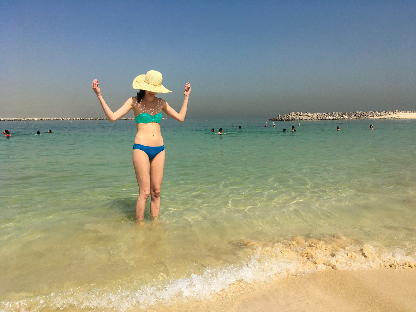 Ráno sme sa nechali zaviezť autobusom na pláž. Všade sme platili kartou, v Dubaji sme hotovosť vôbec nemali. Lenže pri vstupe do areálu pláže sme zistili, že nemajú platobný terminál. Pani v burke nás poslala nejakým smerom. Tak si vravíme, že ten bankomat, o ktorom asi hovorila, skúsime nájsť. Na rad išiel pán za nami. Pravdepodobne domáci. Snažil sa nám vysvetliť, že žiadny bankomat nenájdeme. Nechápali sme… čo budeme teda robiť… a on nám tie lístky kúpil! Nejaký pán z Arabských Emirátov nás zachránil a kúpil nám lístky na pláž. Ďakujeme! A zábava sa môže začať.