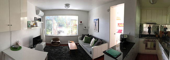 Bytík je otočený na slnečnú severnú stranu (áno, to je tá austrálska slnečná strana) s výhľadom do vnútrobloku a na stromy. Občas je to ako v džungli, keď sa tu prekrikujú papagáje. Tie zvuky sa nedajú popísať. Nikdy sme nič také nepočuli. Sú strašne vtipné. Byt má obývačku, kuchyňu, spálňu a kúpeľňu. Pod bytom je tajný sklep, a k bytu náleží parkovacie miesto, kde spinká náš Holden.
