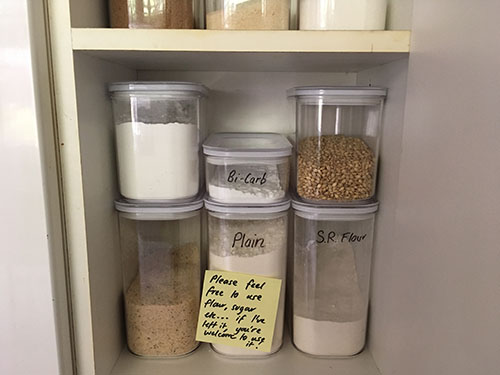 Zistili sme, že tu v obchodoch rozlišujú múku na tú bez kypriaceho prášku (Plain/hladkú) a na múku s pridaným kypriacim práškom (to je tá S.R. Flour). Musím zistiť, či sa tu dá vôbec kúpiť polohrubá a hrubá. Mám pocit, že tu to neriešia a keď pečú koláče, tak z predpripravenej múky/polotovaru ako u nás predávajú balenie na muffiny či krtkův dort. Palacinky tu robia tak, že si kúpia “pancake” plastovú fľašu naplnenú do tretiny múkou so všetkými potrebnými ingredienciami, a pridá sa tam len voda. Rovno sa to v tej fľaši pretrepe, a cesto je hotové.
