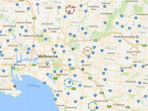 Najprv sme boli ubytovaní v Carnegie (zelená). Potom sme sa presunuli do čínskeho Box Hill-u (oranžová). Prvý byt o ktorý sme zažiadali bol v Kew (hnedá) a druhý, ktorý sa nám páčil bol v Preston-e (červená). Nakoniec sa nám podarilo získať nájom v Prahran-e (modrá). CBD je za rohom a na pláž je to len 15 minút!