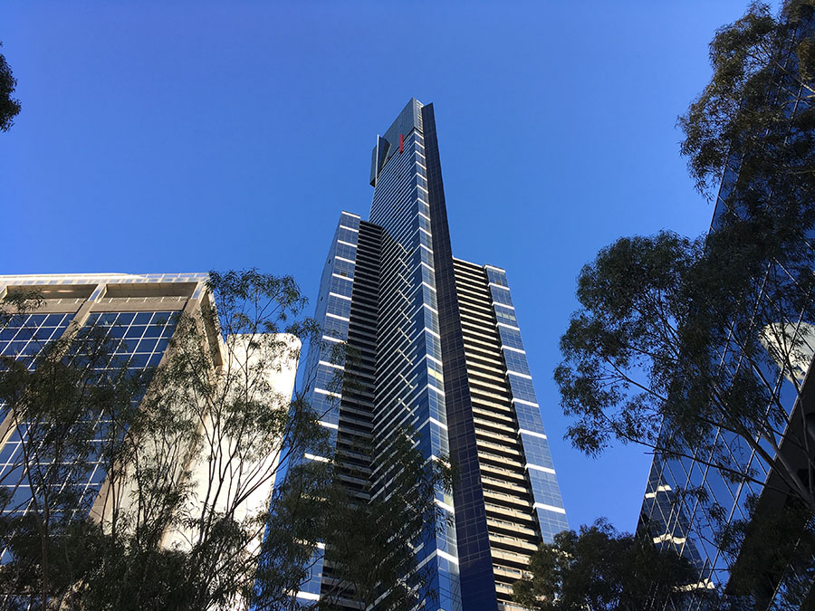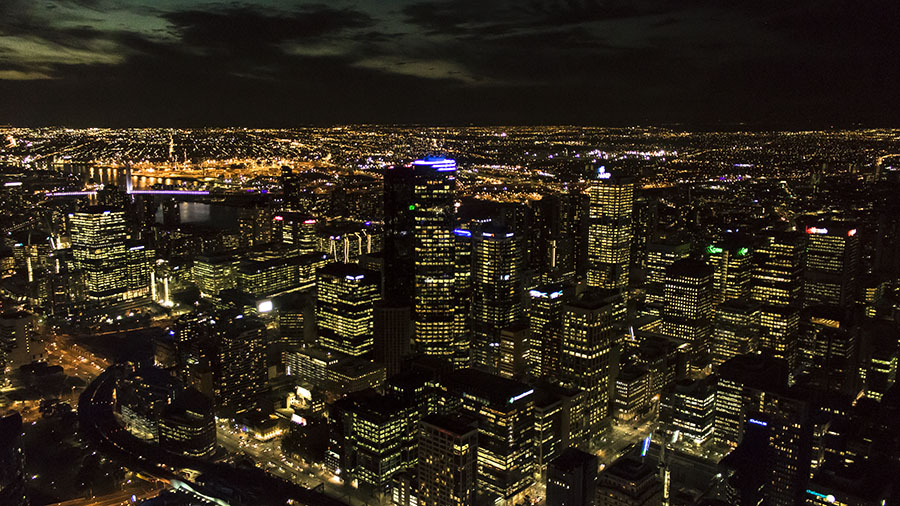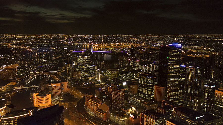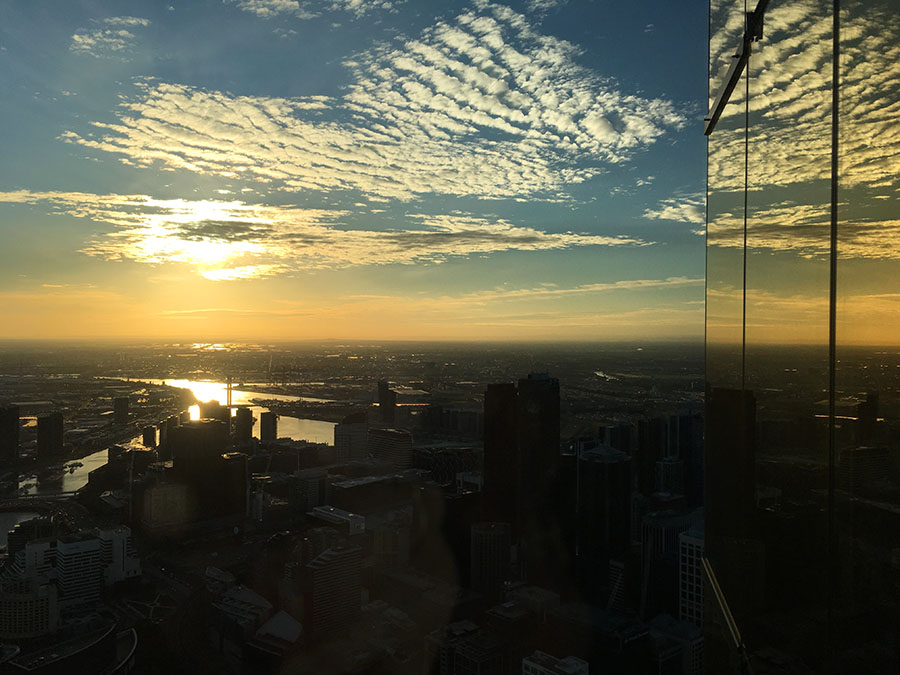 Našli sme to jednoducho – stačilo ísť za najvyššou budovou v okolí. Na naše prekvapenie tam nebol žiadny rad, tak sme sa vôbec nezdržali, ani na kontrole. Výťah nás vyviezol hore, medzitým nám stihlo ešte 3x zaľahnúť v ušiach, a mohli sme sa vydať na 360°výhľad na celé Melbourne. Patro bolo komplet presklené, s jedným vonkajším balkónom, kam sa vchádzalo cez dvoje dvere, ako do nejakej karantény. Tie druhé sme mohli otvoriť až potom, čo sa zatvorili tie prvé.