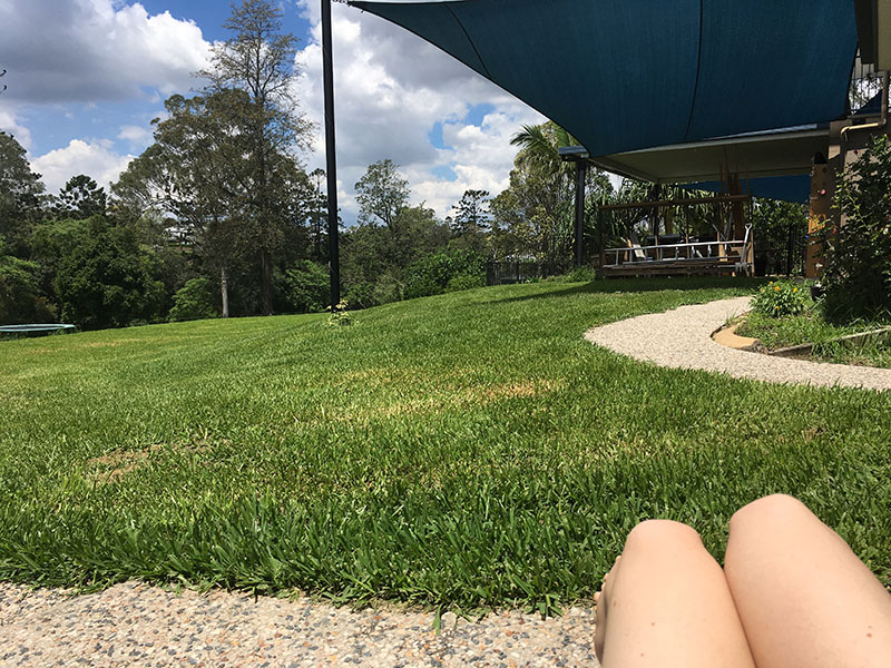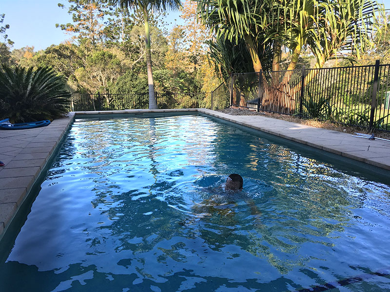 Máme tu takéto slnečné rána. Prišli sme predsa do Queenslandu “the sunshine state”. Zrovna sa slním na obrovskej záhrade pri dome, kde bývame.Jirko vyskúšal bazén so slanou vodou.