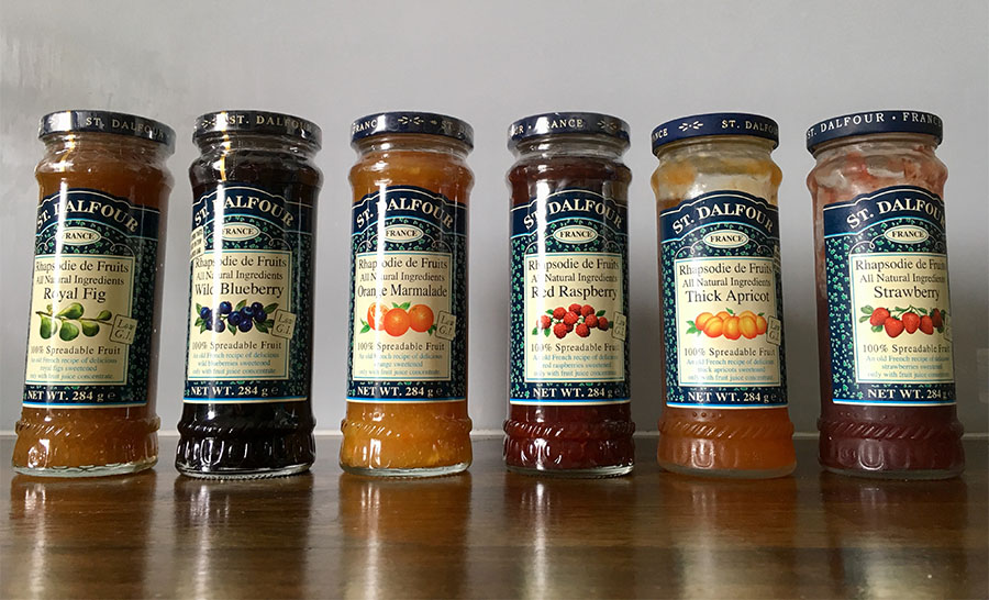 Po kurze ma prišiel vyzdvihnúť manžel a oznámil mi, že bol na nákupe. Mali tam naše obľúbené marmelády len za $3, tak nakúpil ďalšie. Chytila som sa za hlavu, že koľko ich teraz doma budeme mať? Keď sme prišli domov, všetky som vytiahla na linku a máme ich šesť. To budú palacinky! Naše ďalšie hobby je zbierka francúzskych marmelád: