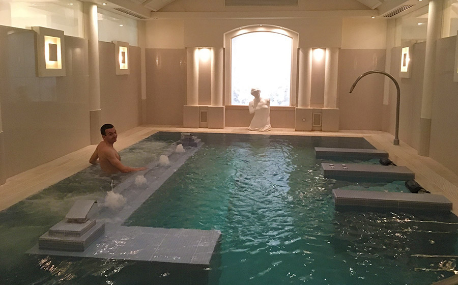 Zobrali si nás do parády. Moja dedikovaná uvádzačka mi ukazovala, kde čo všetko je, kde nájdem infra saunu, kde paru, kde je bazén, ako si spúšťať trysky, ktorá čo robí, kde sa ochladzuje, kde sa oddychuje, kde nás bude po wellness čakať High Tea, a že SPA je síce rozdelené na časť pre mužov a ženy (sauna a para), ale že my môžeme, ako pár, používať paru a saunu v mužskej časti, pretože tu teraz žiadni muži (okrem môjho manžela) nie sú.