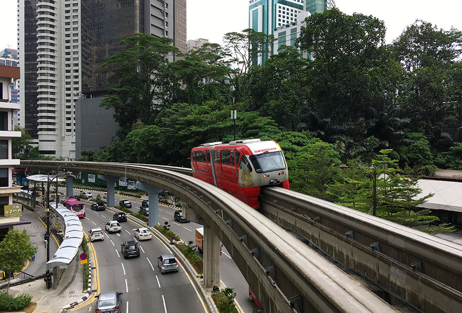Monorail vláčik jazdil dosť často, asi každých 10 minút. Z blízka vyzeral dosť ošuntilo a z vnútra bol ešte viac. v KL jazdí od roku Pána (2003) v očividne nezmenenej podobe. Bola z toho nakoniec historická jazda plná adrenalínu. Stáli sme rovno za strojvodčím, a videli na trasu. Zo stropu viseli záchodové voňačky. Ak niekto z vás bol na 100-ročnej húsenkovej dráhe v Budapešti, tak toto bolo niečo veľmi podobné.