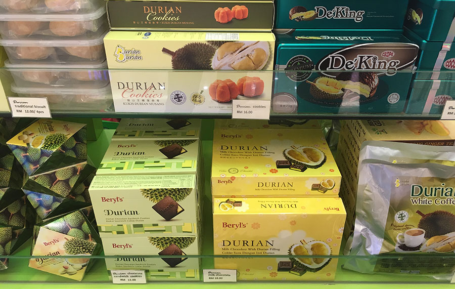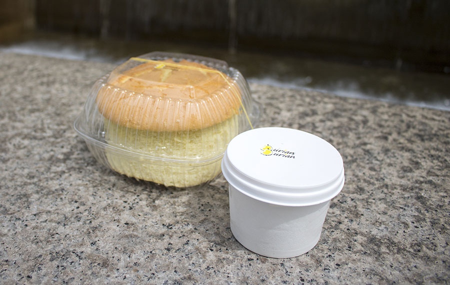 V obchodnom dome sme konečne objavili niečo, čo nás zaujalo – stánok s výrobkami z durianu. Už v Singapure som ho chcela skúsiť, ale kôli tej jeho vôni som nemala odvahu. Teraz je čas. Kúpili sme si zmrzlinu a sponge cake (niečo ako dort z piškótového cesta) a išli sme si ich vychutnať do parku pod veže.