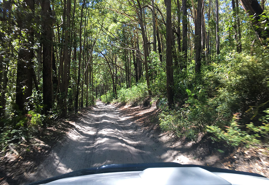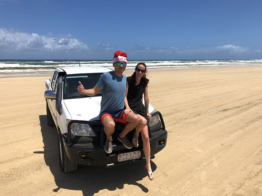 Na 24.12 Jirko zarezervoval výlet autom 4×4 na Fraser Island. Ja to volám austrálske safari (mám to od Madana z Nepálu, lebo tam to volali nepálske safari). Jazdíte po piesku, po pláži… a je to strašne cool. Deň pred výletom sme išli našim autom na nákup, a po návrate sme začali cítiť benzín. Otvorili sme kapotu a zistili čim to je. Palivová hadica sa odrela o akýsi plastový kus v motore, a ten do nej spravil dieru. Jirko s bratrancom ten poškodený kus odrezali a snažili sa to tam znovu primontovať. Skúšali sme rôzne svorky, prehľadali celú dieľňu, lenže hadica už mala svoj vek, a na konci to stále presakovalo. Čo budeme robiť? Zajtra predsa ideme na výlet. Pani mala v dome malý hasičák, tak som ho vzala do auta. Hadicu sme oblepili akousi čiernou páskou čo sme našli v skrini a modlili sa, aby sme došli na trajekt a naspäť. Vyrazili sme skoro ráno, aby sme stihli prvú loď na Fraser Island. Auto stále smrdelo benzínom, ale došli sme.