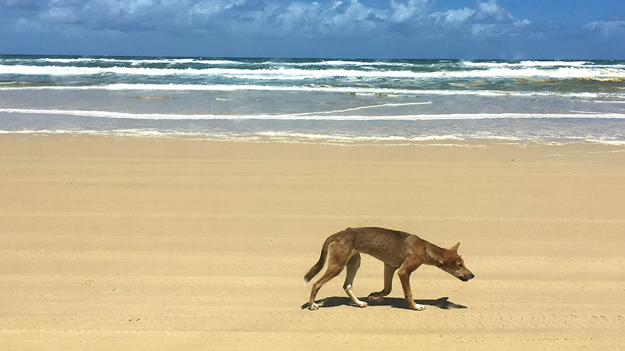 Po dvoch hodinách blbnutia na jazere, ktoré vrhalo snáď všetky možné odtiene azúrovej, už ľudia začali prichádzať a zaplňovalo sa to tam. Bol čas vydať sa ďalej, na jazdu po jednej z najdlhších pláží na svete, 75 miles beach (120 km), a konečne uzrieť div(n)ého psa Dinga. Súčasťou školenia na 4×4 boli aj pokyny, ako sa v ich blízkosti chovať. Ľudia si totiž často neuvedomujú, že sú divokí, chcú sa k nim chovať ako k domácim miláčikom. Už sa stalo, že napadli ľudí, alebo dokonca odniesli malé deti. Ich povaha je totiž podobná vlkom.