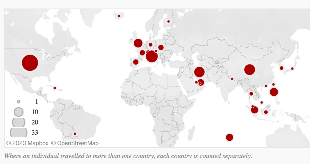 V menšej miere orgány určili krajiny, ktoré navštívili ľudia, ktorí boli na vírus pozitívni. Z týchto prípadov boli najbežnejšou navštívenou krajinou Spojené štáty Americké, nasledované Talianskom, Čínou, Iránom a UK.