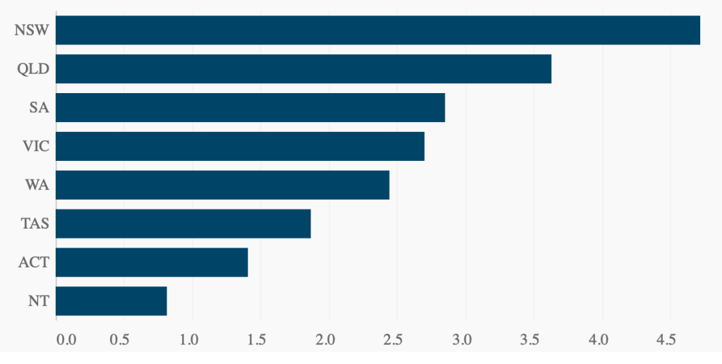 NSW má najvyšší počet prípadov, čo predstavuje 43 percent z celkového počtu infekcií, po ktorých nasleduje Victoria, a potom Queensland.