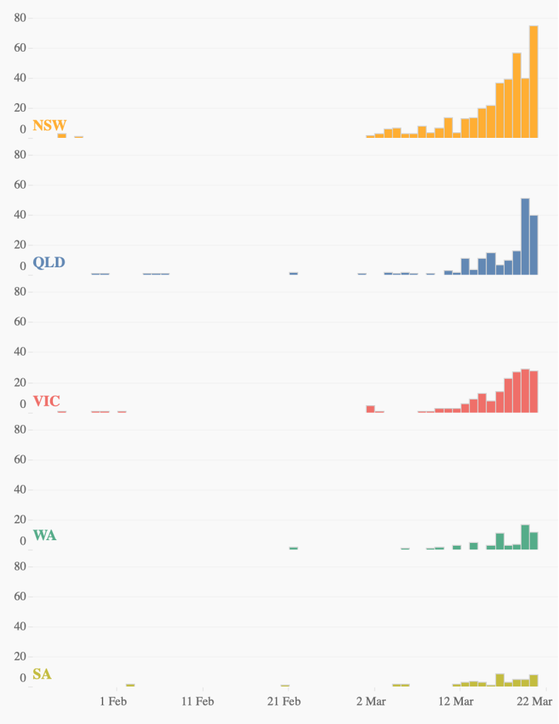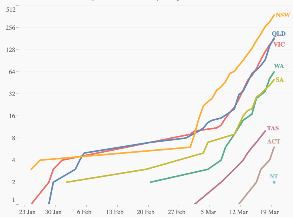 Počet potvrdených prípadov COVID-19 v Austrálii sa každé 3 až 4 dni zdvojnásobuje, pričom národné číslo teraz presahuje 870.