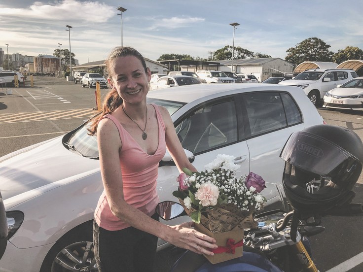 Jirko zrazu vytiahol kyticu. Čože?! Doniesol mi ju na motorke!