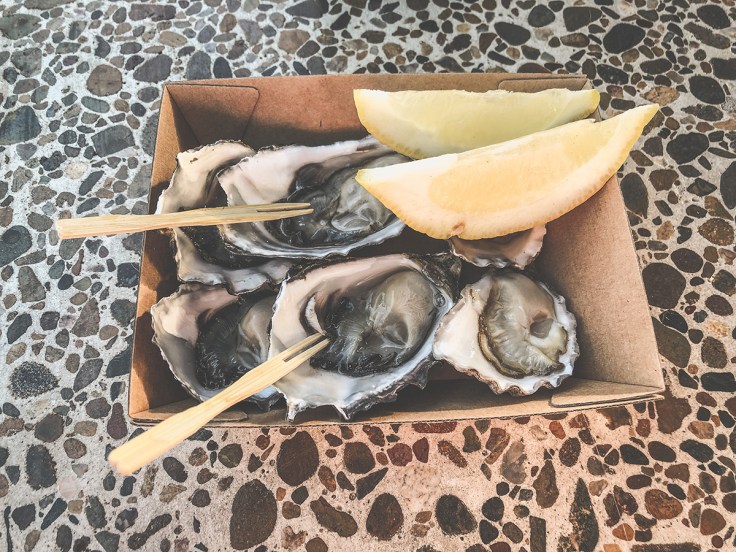 Dali sme areálom kolečko, aby sme zistili, čo všetko prežilo a čo je zatvorené. Naše obľúbené stánky, vrátane toho s ústricami, tam stále boli. HURÁ! Ide sa na predjedlo – na čerstvé ústrice.