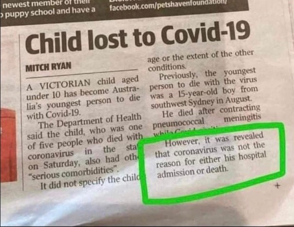 Názorná ukážka (toto by malo byť trestné). Nadpis hovorí, že dieťa umrelo na Kovid, ale na konci článku sa dozviete, že vlastne na ten Kovid neumrelo. Ako toto môžu noviny publikovať?