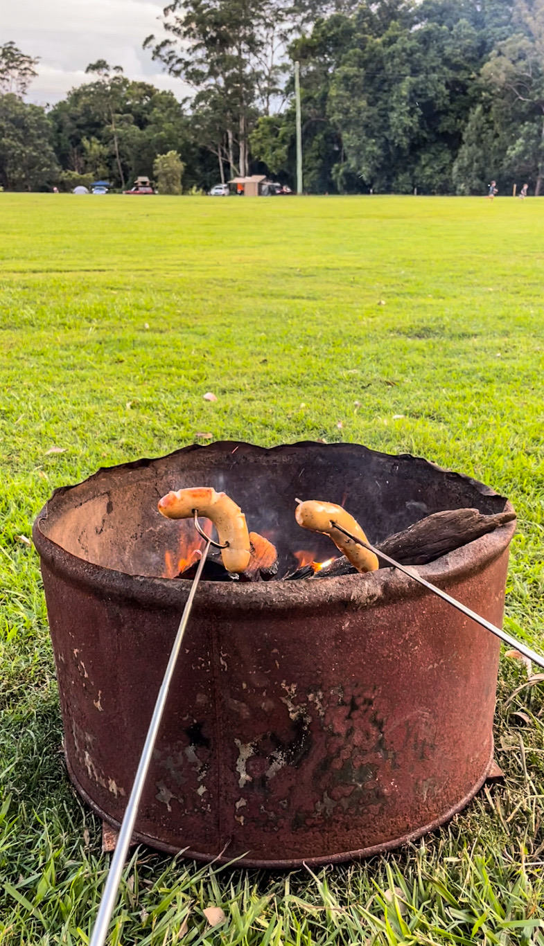 Po štvrtej hodine odpolední sa začala miestom rozliehať vôňa grilov a ohnísk. Ja som, po nedávnej skúsenosti so zapaľovaním austrálskeho „bezpečnostného“ (rozumej nehorľavého) dreva, zobrala “Pepa” podpaľovača, ale akosi som už neskúmala, či nie je náhodou prošlý. Bol. To čo ho robilo horľavým vyprchalo a ostal z toho len kúsok polysterénu, ktorý nechcel horieť. Našťastie nekempujeme prvý krát a keď sme sa boli pozrieť pri Creeku, nazbierali sme aj pár suchých halúzok. To nás zachránilo. Horeli perfektne a od toho sa už potom chytilo aj to nehorľavé drevo. Musí to byť miestna špecialita. Všetci sa s tým ohňom vždy trápia. Ono nechce horieť, ale keď sa po urputnom vzdore chytí, horí dlho.