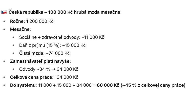 - ČR: odvody zamestnávateľa sú vyššie, ale idú priamo do štátneho systému (dôchodky, zdravotníctvo). Zamestnanec „na páske“ vidí cca 11 % odvody + 15 % daň z príjmu. Ale v realite vrátane odvodov zamestnávateľa ide do systému cca 45 %.