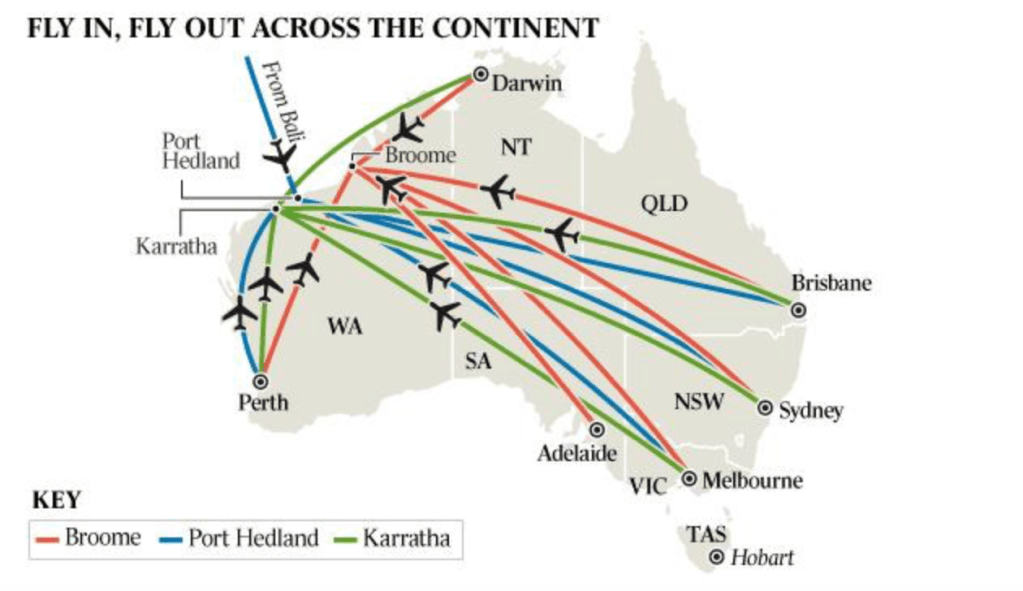 V Austrálii je známy pojem FIFOFly-In Fly-Out. Označuje spôsob práce, pri ktorom zamestnanci dochádzajú letecky na vzdialené pracoviská, často do odľahlých oblastí ako sú bane alebo ťažobné regióny, kde ostávajú niekoľko dní či týždňov v kuse. Potom sa vracajú domov na pár dní voľna a celý cyklus sa opakuje. Na prvý pohľad ide o výhodnú prácu: vysoký plat, benefity, stabilita. No realita FIFO života býva zložitá.